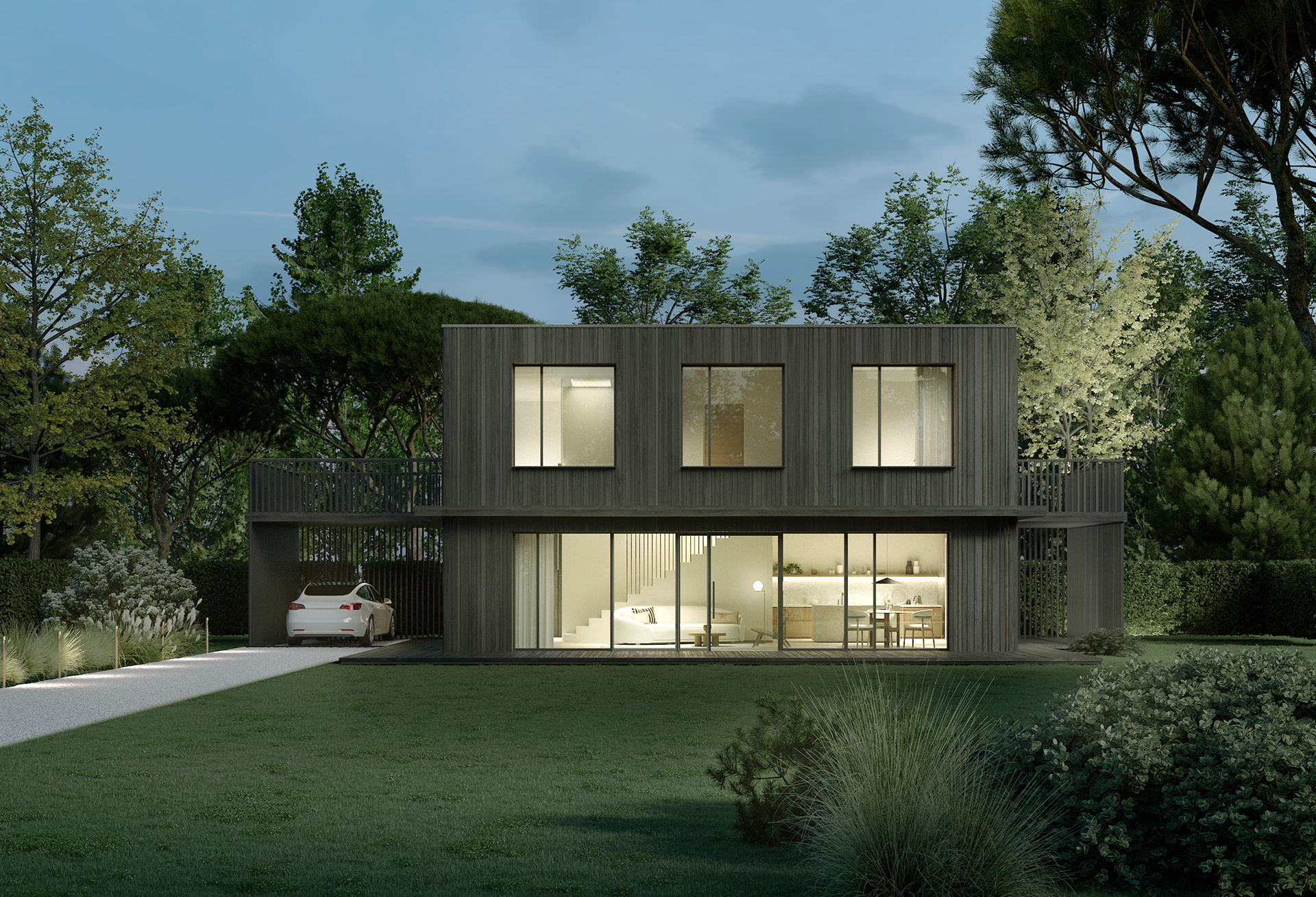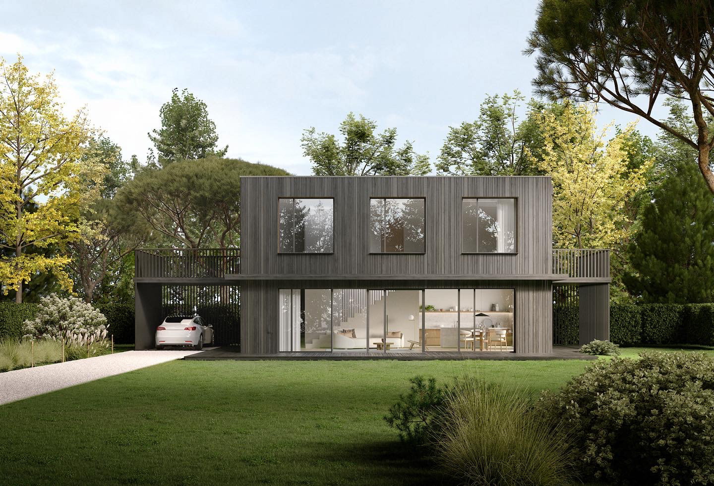 This house takes Villa M’s structural foundation and strips it to its essential components. It’s a testing ground for minimal means with maximum clarity—fewer materials, tighter budget, bolder experiment. I reduced the palette to timber cladding and large glazed panels. No deep overhangs or terraces here—just the core volume testing how simple the form can get before it loses character.